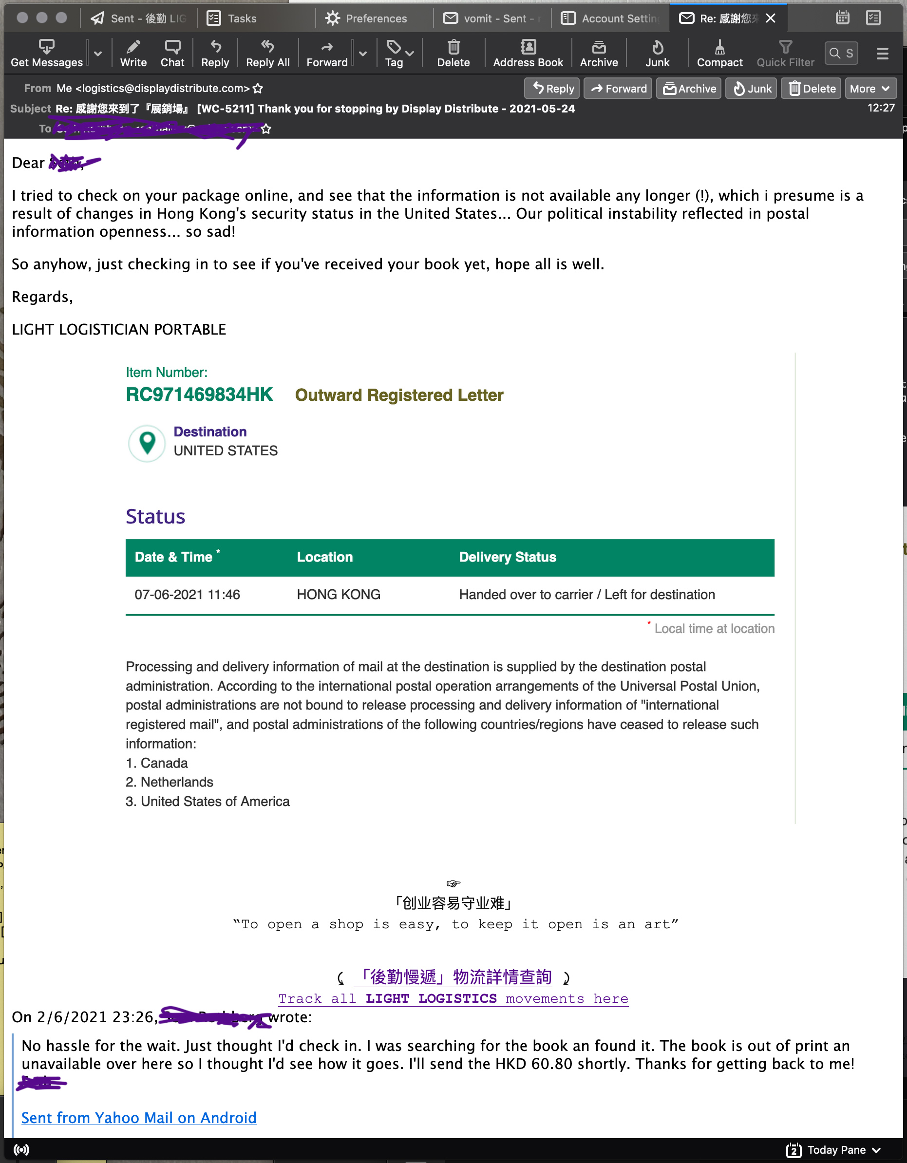 從屯門轉運中心來信:「大家好!如果收件人可以自己付郵費,我們沒問題呀,畢竟疫情期間我們都已經妥協了不少,郵寄了書好幾次了。看收件人方便的話,能麻煩妳給收到之後給我們說一下發幾張照片?我們想好好紀錄這條路線的完成,也想恭喜你們一下——這次的緩件號HQL-306現在已經成為了我們目前最慢的單!從香港的問候,慢遞員何子