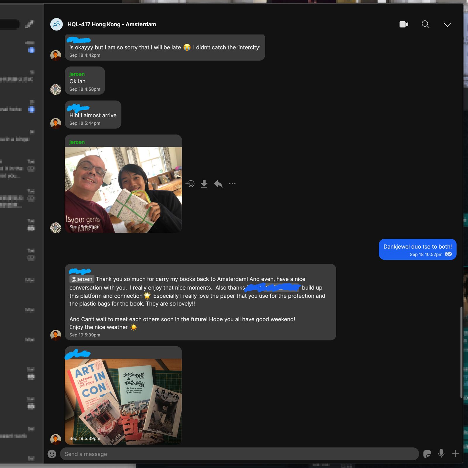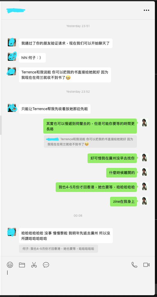 Having arrived in the mainland from Hong Kong with several dispatches (see HQL-382) including HQL-373, courier Ms. HO contacts the receiver to arrange delivery only to find that since the time of placing his order, he has relocated to the Netherlands for studies; the receiver arranges for a friend of his to take the zine instead, though she will have to wait a few more months before Ms. HO returns to Hong Kong