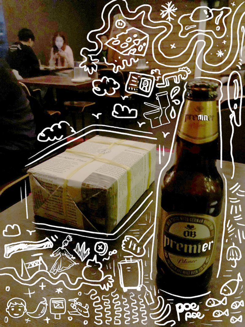 過了很長時間,收件葉先生和收件人終於越好在獨立藝術空間『據點。句點』的一個開幕式交接,可是收件人遲到了一個小時,到場的時候葉先生已不見。收件人離開之前還好問了吧台的人,原來緩件留下了等她收